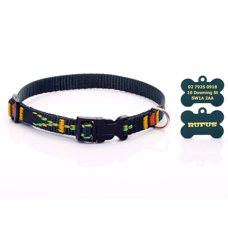 Този регулируем ацтеките модел найлон яка е удобна, здрава и предлага в 4 ширини. Той идва с съвпадение на двустранен етикет куче, което може да бъде отпечатан с произволен текст ви харесва. Печатни куче тагове, които са трайни и по-лесно да се чете, отколкото традиционните гравирани тагове.