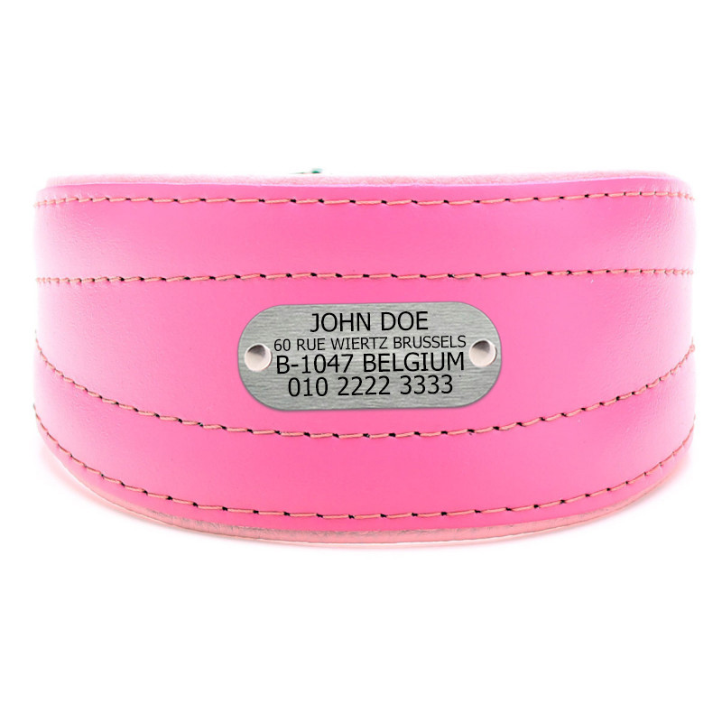 Wir haben unsere hochwertigen gepolsterten Hundehalsbänder aus Leder genommen und mit einer bedruckten Metallplatte personalisiert. Ihr Hund wird das weich gepolsterte Halsband zu schätzen wissen, während Sie sich etwas weniger Sorgen machen müssen, weil Sie wissen, dass die Marke nicht abfällt, wenn er Füchse durch den Park jagt. Das Halsband wurde speziell für den Komfort Ihres Blindenhundes entwickelt. Der schmale Verschluss passt leicht unter das Kinn, und das Halsband verbreitert sich im Nacken, so dass es sitzen kann, ohne zu scheuern. Dieses Design ist hilfreich, um zu verhindern, dass Ihr Hund aus dem Halsband rutscht, falls ein Kaninchen es wagt, Ihren Weg zu kreuzen. Das weiche, hypoallergene, gepolsterte Innenfutter bedeutet, dass keine Kragenlinien in ihr Fell geschnitzt sind, und die Vorderseite aus echtem Leder ist sowohl haltbar als auch stilvoll. Wir bieten eine Vielzahl von Farbkombinationen von Vorderleder und gepolstertem Innenfutter an, damit sich Ihr Hund wohl und stilvoll fühlt. Der geschweißte D-Ring ist sehr stabil und nimmt alle gängigen Hundeleinen auf. Die haltbare Chromschnalle hält den Riemen fest und sichert jeden Hund ein Leben lang.