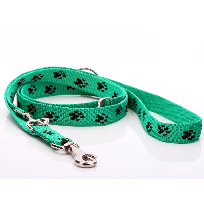 Diese Hundeleine mit Pfotenabdruck ist auf verschiedene Längen einstellbar, die von 120 cm (47") bis 220 cm (87") reichen. Sie besteht aus strapazierfähigem Nylon, das superstark ist. Der Verschluss ist federbelastet, so dass er leicht auf das Hundehalsband gesteckt werden kann. Jede Breite hat einen unterschiedlich großen Verschluss, was dazu beiträgt, das Gesamtgewicht bei den kleineren Größen niedrig zu halten. Verstellbare Leinen sind sowohl für das Training als auch für den täglichen Gebrauch geeignet. Sie ist auch als Polizeihund-Ausbildungsleine bekannt und hat mindestens 6 verschiedene Verwendungsmöglichkeiten, darunter 1) eine kurze Leine für das Training oder den normalen Gebrauch, 2) eine mittlere Leine für das Training, 3) eine lange Leine für das Training, 4) das gleichzeitige Führen von 2 Hunden! 5) Über die Schulter oder um die Taille drapiert, um die Hände frei zu halten 6) Vorübergehende Anbindevorrichtung.