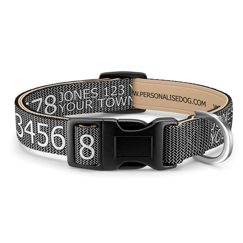 Wir haben dieses Halsband geschaffen, weil wir unsere Hunde lieben und sie schützen wollen. Wir haben ein sehr praktisches und robustes Halsbanddesign gewählt und es perfektioniert, indem wir den größten verfügbaren Platz für die Personalisierung bieten. Mit modernster Ausrüstung können wir Ihre Informationen sehr deutlich auf das Halsband drucken. Selbst der kleine Text wird lesbar sein und könnte helfen, das Leben Ihres Hundes zu retten. Sie können dieses Halsband mit jedem beliebigen Text personalisieren, den Sie wünschen. Nach britischem Recht benötigt das Halsband den Namen und die Adresse des Besitzers, aber wir empfehlen dringend, auch Ihre Mobiltelefonnummer anzugeben. Darüber hinaus können Sie weitere wichtige Informationen hinzufügen, wie z.B. den Gesundheitszustand, eine zweite Telefonnummer oder die Telefonnummer Ihres Tierarztes. Besitzer von Hunden, die dazu neigen, Schlamm wie Magnete anzuziehen, werden sich freuen zu hören, dass die Halsbänder in der Maschine waschbar sind. Legen Sie sie einfach zusammen mit Ihren farbigen Stoffen in die Maschine und verwenden Sie ein Feinwaschmittel und eine niedrige Temperatur. Vorausgesetzt, Sie waschen sie nicht jeden Tag, sollte Ihr Halsband jahrelang benutzt werden. Eine starke Schnalle aus gehärtetem Kunststoff macht es leicht, dieses Halsband an- und auszuziehen. Wir verwenden auch einen geschweißten D-Ring, der an jeder Hundeleine befestigt werden kann - er ist unzerbrechlich gemacht!