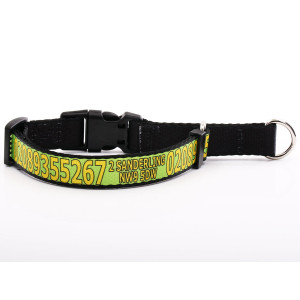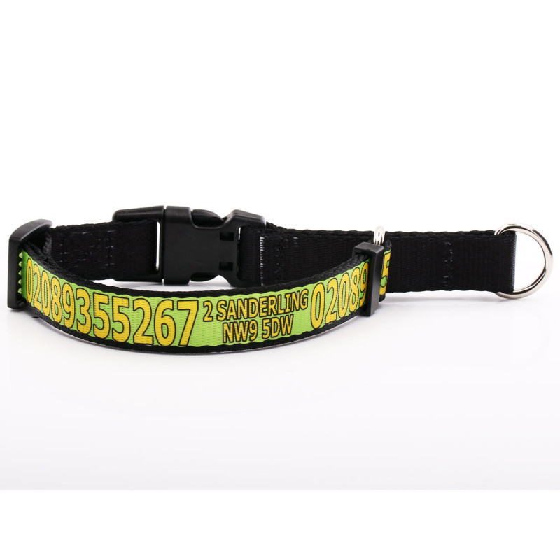 Unsere erstklassigen verstellbaren Hundehalsbänder sind von hoher Qualität und werden mit Ihrem Telefon und Ihrer Adresse oder einem von Ihnen gewählten Text personalisiert. Durch den Einsatz der neuesten und besten Drucktechnologie sind wir in der Lage, Ihnen eine qualitativ hochwertige Kennzeichnung für Ihren Hund zu liefern, die leicht zu lesen und extrem haltbar ist und der Hundekontrollverordnung von 1992 entspricht. Unabhängig von der Abnutzung wird der Druck nicht abgerieben oder verblassen. Das Halsband ist so konzipiert, dass es effizient und extrem sicher ist. Im Gegensatz zu kleineren Designs, die eine Würgekette verwenden, die Ihrem geliebten Haustier Verletzungen zufügen kann, ist unser Design besonders sicher, da keine Ketten verwendet werden. Unsere Konstruktion ist bei Hundetrainern wegen ihrer Haltbarkeit, Wirksamkeit beim Training und Sicherheit beliebt. Das Halsband besteht aus strapazierfähigem Polyester und ist für Sicherheit und Bequemlichkeit mit einer starken, schnell lösbaren Schnalle versehen.