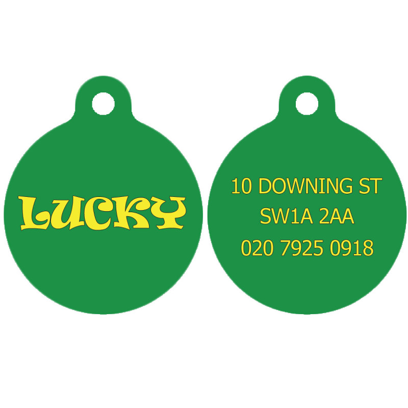 Unsere Hundemarken sind äußerst beliebt, weil sie farbenfroh und einzigartig sind und vollständig individuell gestaltet werden können. Durch den Druck auf Aluminium erhalten wir eine haltbare Oberfläche, die gut sichtbar ist. Was gibt es Besseres, um Ihren Hund sicher und stilvoll zu halten, als eine farbenfrohe, individuell gestaltete Hundemarke! Sie haben die Möglichkeit, jede Seite der Marke unabhängig voneinander zu personalisieren. Die meisten Kunden entscheiden sich dafür, die Vorderseite des Anhängers mit einem einzigen Namen bedrucken zu lassen und die Rückseite mit allen wichtigen Kontaktdaten zu versehen. Wir legen einen schweren Schlüsselring bei, den Sie an Ihrem bestehenden Halsband befestigen können. Er ist stark genug, um sicherzustellen, dass der Anhänger niemals herunterfällt.