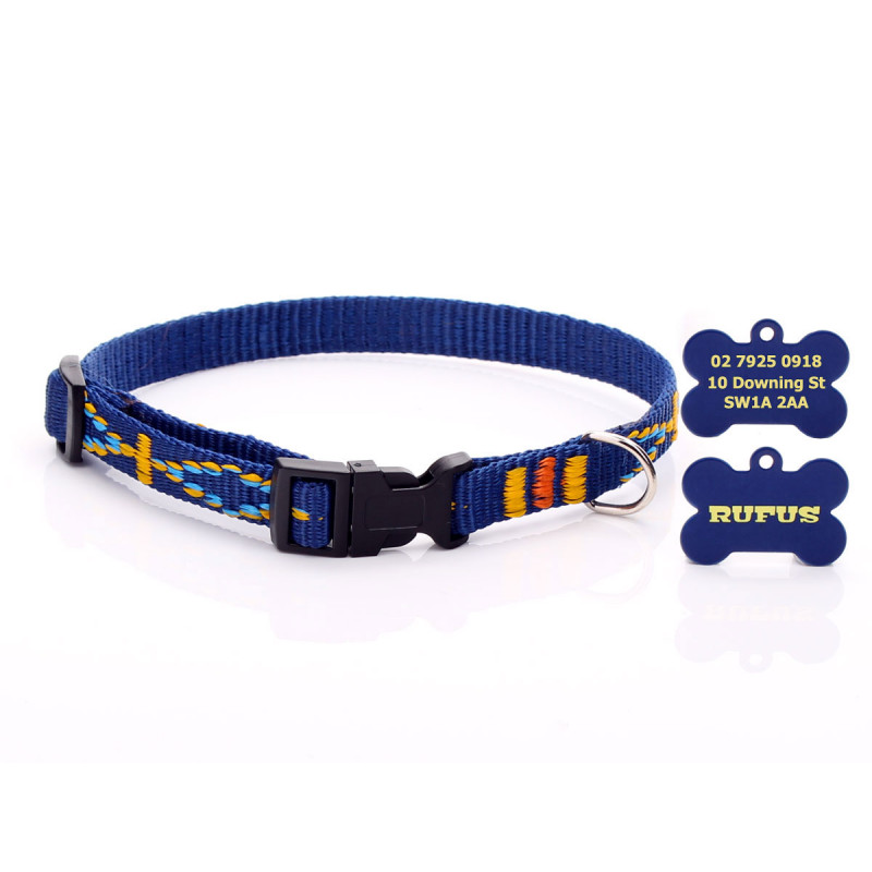 Dieses verstellbare Nylonhalsband mit Aztekenmuster ist bequem, stark und in 4 Breiten erhältlich. Es wird mit einer passenden zweiseitigen Hundemarke geliefert, die mit beliebigem Text bedruckt werden kann. Bedruckte Hundemarken sind haltbar und leichter zu lesen als herkömmliche gravierte Marken.