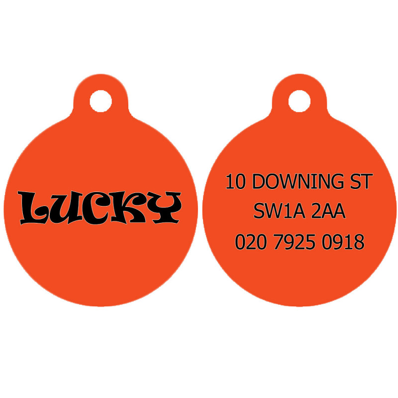 Unsere Hundemarken sind äußerst beliebt, weil sie farbenfroh und einzigartig sind und vollständig individuell gestaltet werden können. Durch den Druck auf Aluminium erhalten wir eine haltbare Oberfläche, die gut sichtbar ist. Was gibt es Besseres, um Ihren Hund sicher und stilvoll zu halten, als eine farbenfrohe, individuell gestaltete Hundemarke! Sie haben die Möglichkeit, jede Seite der Marke unabhängig voneinander zu personalisieren. Die meisten Kunden entscheiden sich dafür, die Vorderseite des Anhängers mit einem einzigen Namen bedrucken zu lassen und die Rückseite mit allen wichtigen Kontaktdaten zu versehen. Wir legen einen schweren Schlüsselring bei, den Sie an Ihrem bestehenden Halsband befestigen können. Er ist stark genug, um sicherzustellen, dass der Anhänger niemals herunterfällt.