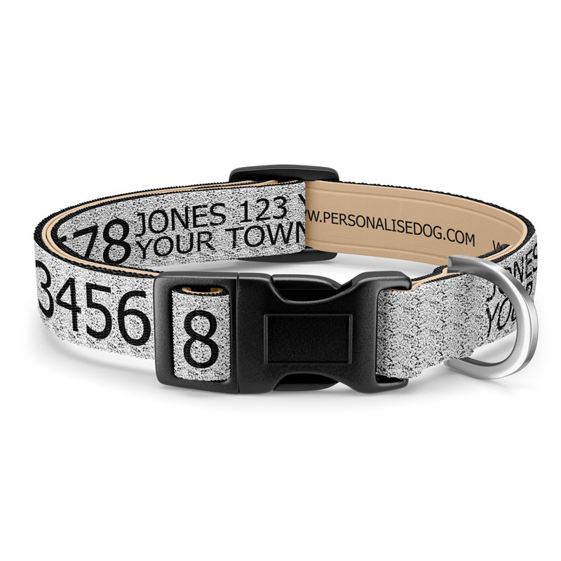 Wir haben dieses Halsband geschaffen, weil wir unsere Hunde lieben und sie schützen wollen. Wir haben ein sehr praktisches und robustes Halsbanddesign gewählt und es perfektioniert, indem wir den größten verfügbaren Platz für die Personalisierung bieten. Mit modernster Ausrüstung können wir Ihre Informationen sehr deutlich auf das Halsband drucken. Selbst der kleine Text wird lesbar sein und könnte helfen, das Leben Ihres Hundes zu retten. Sie können dieses Halsband mit jedem beliebigen Text personalisieren, den Sie wünschen. Nach britischem Recht benötigt das Halsband den Namen und die Adresse des Besitzers, aber wir empfehlen dringend, auch Ihre Mobiltelefonnummer anzugeben. Darüber hinaus können Sie weitere wichtige Informationen hinzufügen, wie z.B. den Gesundheitszustand, eine zweite Telefonnummer oder die Telefonnummer Ihres Tierarztes. Besitzer von Hunden, die dazu neigen, Schlamm wie Magnete anzuziehen, werden sich freuen zu hören, dass die Halsbänder in der Maschine waschbar sind. Legen Sie sie einfach zusammen mit Ihren farbigen Stoffen in die Maschine und verwenden Sie ein Feinwaschmittel und eine niedrige Temperatur. Vorausgesetzt, Sie waschen sie nicht jeden Tag, sollte Ihr Halsband jahrelang benutzt werden. Eine starke Schnalle aus gehärtetem Kunststoff macht es leicht, dieses Halsband an- und auszuziehen. Wir verwenden auch einen geschweißten D-Ring, der an jeder Hundeleine befestigt werden kann - er ist unzerbrechlich gemacht!