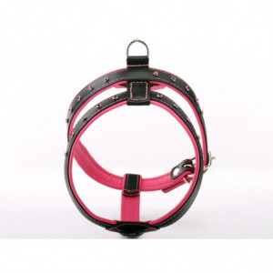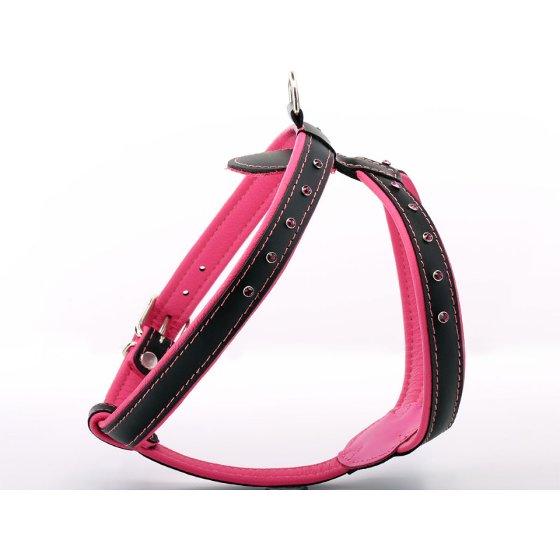 Dieses Hundegeschirr aus echtem Leder ist mit diamantenen Nieten verziert. Es besteht aus hochwertigem Leder mit einer weichen Polsterschicht, die ein Scheuern verhindert, und ist mit langlebigen verchromten Beschlägen ausgestattet. Fügen Sie eine personalisierte Hundemarke und eine passende Leine hinzu, um ein auffälliges Set zu schaffen.