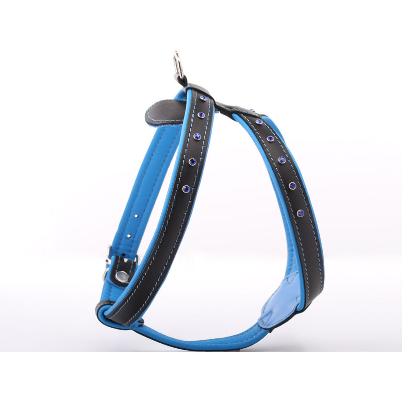 Este arnés para perro de cuero genuino está decorado con remaches de diamantes. Está hecho de cuero de alta calidad con una capa suave de acolchado para evitar rozaduras y está equipado con herrajes cromados duraderos. Agregue una placa de identificación personalizada y una correa a juego para crear un conjunto llamativo.