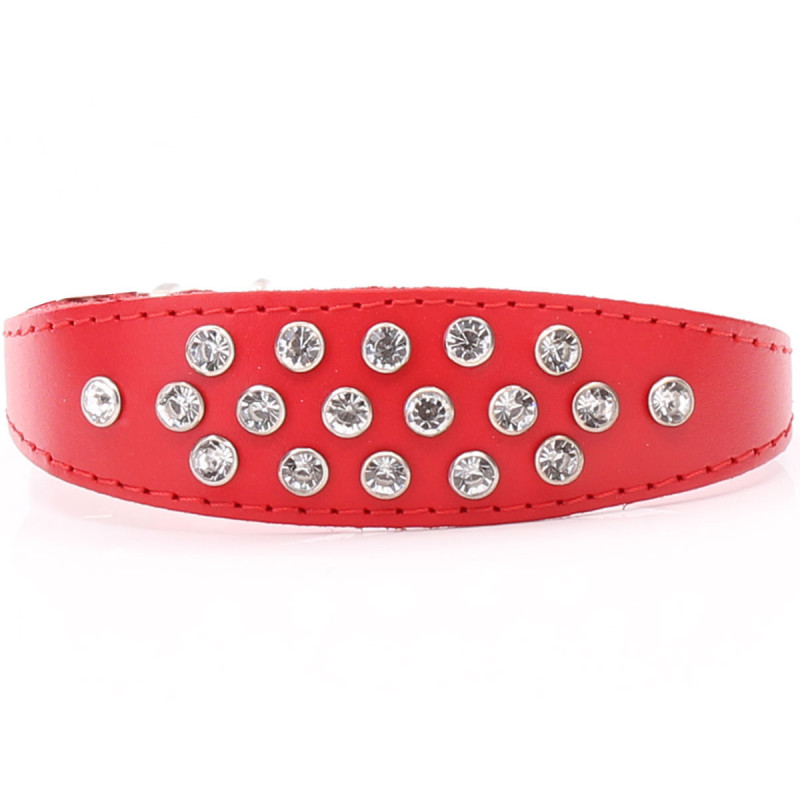 Este lujoso collar está decorado con cristales Swarovski y tiene una hebilla que también está adornada con cristales brillantes. Hecho de cuero genuino con un respaldo de cuero suave de grano completo, es liviano y súper cómodo para su perro. El cierre estrecho se ajusta fácilmente debajo de la barbilla y el cuello se ensancha ligeramente en la parte posterior del cuello para sentarse sin causar rozaduras.