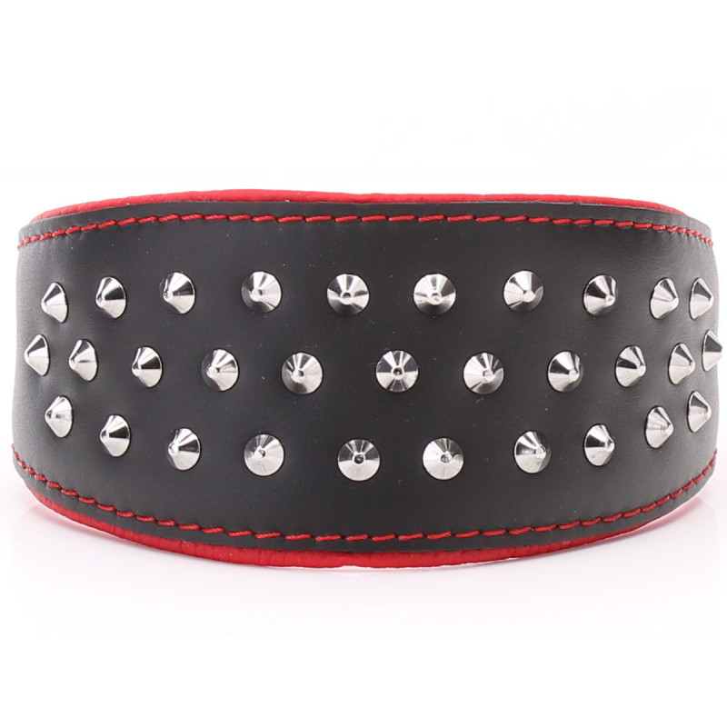 Este lujoso collar está decorado con púas de metal y está diseñado para la comodidad. El cierre estrecho se ajusta fácilmente debajo de la barbilla y el cuello se ensancha en la parte posterior del cuello para sentarse sin causar rozaduras. El acolchado de cuero suave en la espalda significa que no tendrá líneas de cuello talladas en su piel y el frente de cuero real es duradero y elegante.