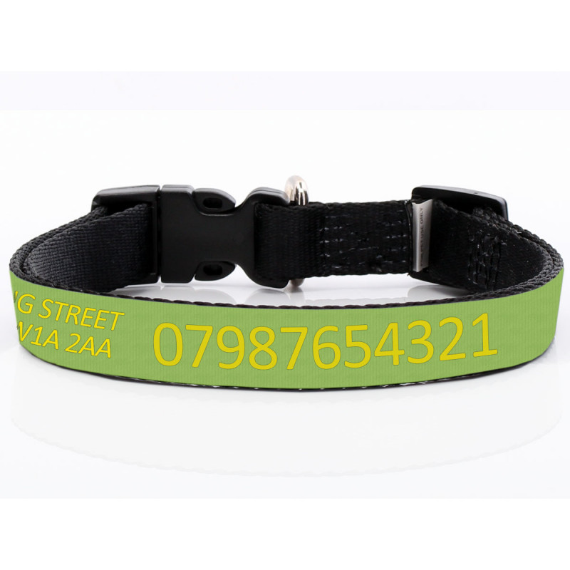 Creamos este collar porque amamos a nuestros perros y queremos protegerlos. Tomamos un diseño de cuello muy práctico y fuerte y lo perfeccionamos ofreciendo el mayor espacio de personalización disponible. Utilizando equipos de última generación, podemos imprimir su información con mucha claridad en el cuello. Incluso el texto pequeño será legible y podría ayudar a salvar la vida de su perro. Puede personalizar este collar con cualquier texto que desee. La ley del Reino Unido establece que el collar necesita el nombre y la dirección del propietario, pero recomendamos encarecidamente agregar también su número de teléfono móvil. Además, puede agregar otra información importante, como una afección médica, un número de teléfono secundario o el número de teléfono de su veterinario. Los dueños de perros que tienden a atraer lodo como imanes estarán felices de saber que los collares se pueden lavar a máquina. Solo colóquelo con sus telas de colores y use un detergente suave y de baja temperatura. Siempre que no los lave todos los días, su collar debería tener años de uso. Una fuerte hebilla de plástico endurecido hace que este collar sea fácil de poner y quitar. También utilizamos un anillo en D soldado que se adhiere a cualquier correa de perro, ¡Está hecho para ser irrompible!