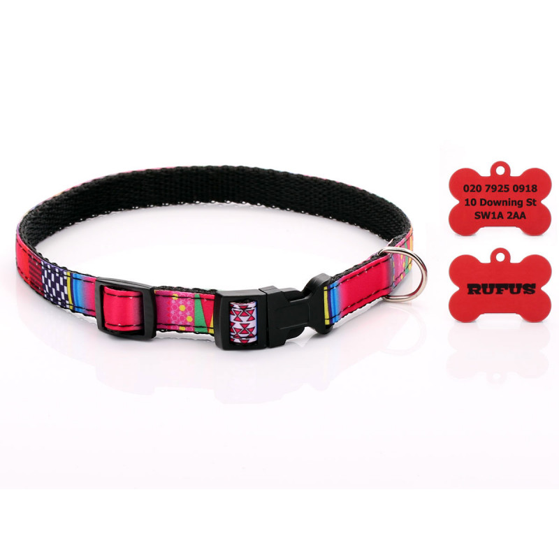 Collar Para Perro Con Mosaico Rojo Y Rosa Con Etiqueta A Juego