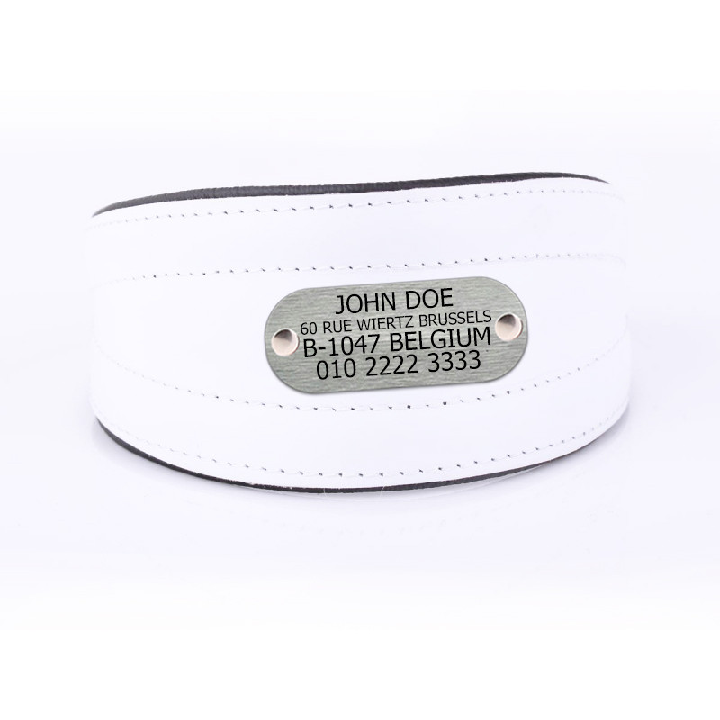 Hemos tomado nuestros collares de perro acolchados de cuero de alta calidad y hemos agregado personalización con una placa de metal impresa. Su perro apreciará el collar acolchado suave, mientras que usted se preocupará un poco menos sabiendo que la etiqueta no se caerá mientras persigue a los zorros por el parque. Especialmente diseñado para la comodidad de su perro de caza. El cierre estrecho se ajusta fácilmente debajo de la barbilla y el cuello se ensancha en la parte posterior del cuello para mantenerse sin causar rozaduras. Este diseño es útil para evitar que su perro se salga del collar en caso de que un conejo se atreva a cruzarse en su camino. El suave forro acolchado hipoalergénico significa que no tendrá líneas de cuello talladas en su piel y el frente de cuero real es duradero y elegante. Ofrecemos una multitud de combinaciones de colores de forro acolchado y cuero frontal para garantizar que su perro se sienta cómodo y elegante. El anillo en D soldado es muy fuerte y se adapta a todas las correas para perros estándar. La hebilla cromada duradera sujeta la correa firmemente y asegurará a cualquier perro durante toda su vida.