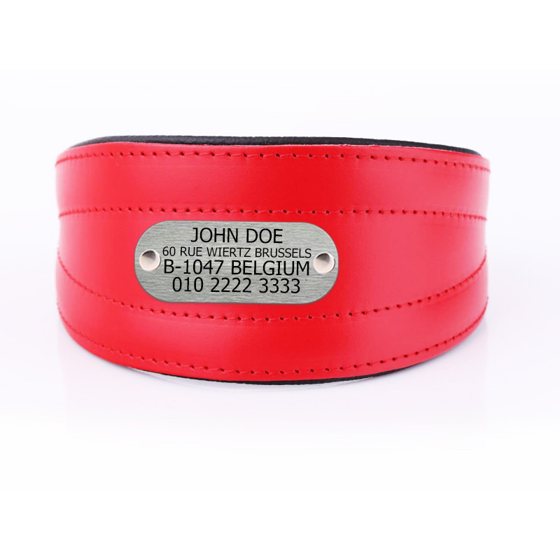 Hemos tomado nuestros collares de perro acolchados de cuero de alta calidad y hemos agregado personalización con una placa de metal impresa. Su perro apreciará el collar acolchado suave, mientras que usted se preocupará un poco menos sabiendo que la etiqueta no se caerá mientras persigue a los zorros por el parque. Especialmente diseñado para la comodidad de su perro de caza. El cierre estrecho se ajusta fácilmente debajo de la barbilla y el cuello se ensancha en la parte posterior del cuello para mantenerse sin causar rozaduras. Este diseño es útil para evitar que su perro se salga del collar en caso de que un conejo se atreva a cruzarse en su camino. El suave forro acolchado hipoalergénico significa que no tendrá líneas de cuello talladas en su piel y el frente de cuero real es duradero y elegante. Ofrecemos una multitud de combinaciones de colores de forro acolchado y cuero frontal para garantizar que su perro se sienta cómodo y elegante. El anillo en D soldado es muy fuerte y se adapta a todas las correas para perros estándar. La hebilla cromada duradera sujeta la correa firmemente y asegurará a cualquier perro durante toda su vida.