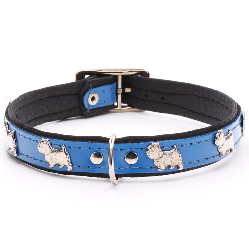 Originario de Escocia con una rica historia que se remonta al siglo XVI, el West Highland White Terrier es un perro hermoso que es genial con los niños y muy leal. Rebosantes de personalidad, se sabe que son independientes y confiados. Qué mejor manera de tratar a su perro que con este collar de cuero acolchado adornado con Westies de metal pulido. Está disponible en 6 colores y 2 tamaños. Asegúrese de combinarlo con una placa de identificación personalizada y un cuenco personalizado.