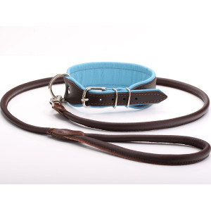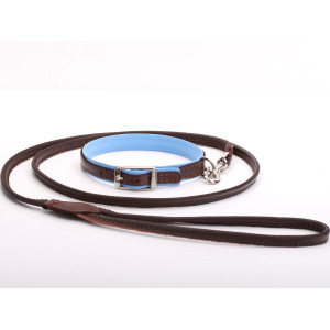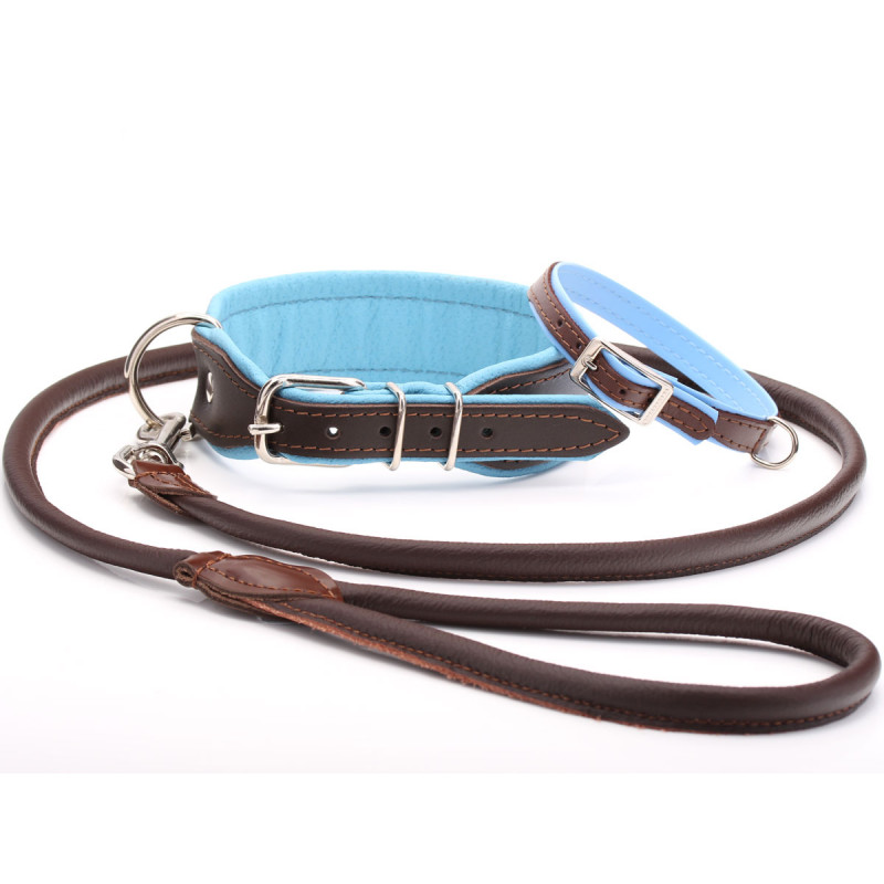 Conjunto De Collar Y Correa De Perro De Cuero Marrón Y Azul Hecho A Mano