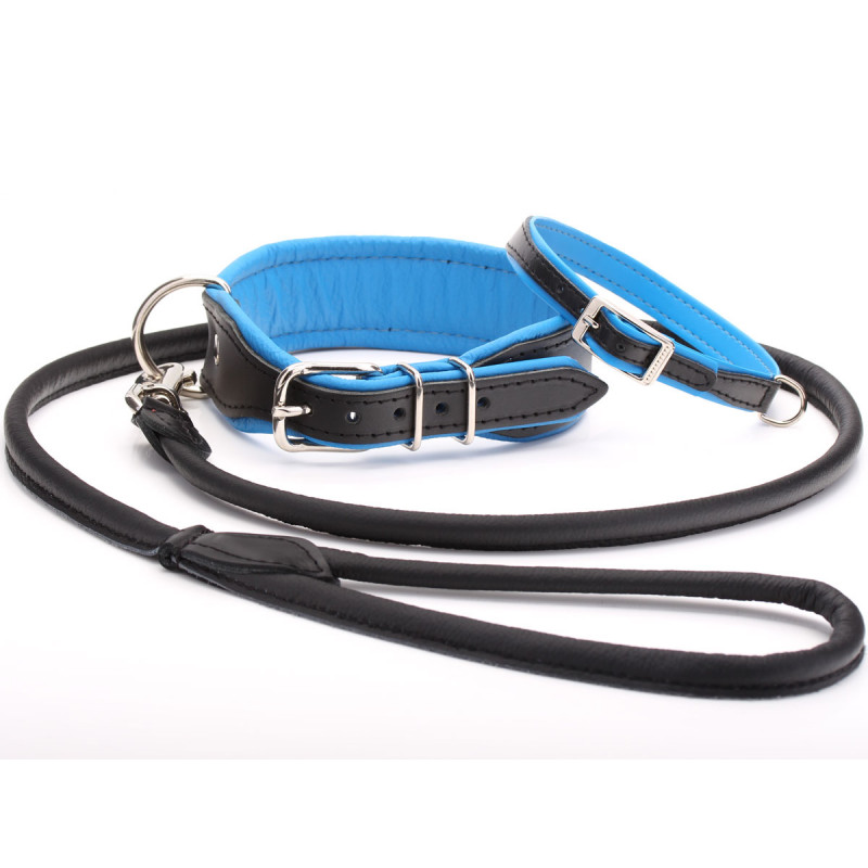 Conjunto De Collar Y Correa De Perro De Cuero Negro Y Azul Hecho A Mano
