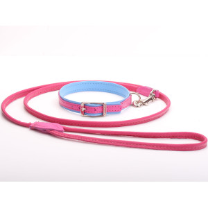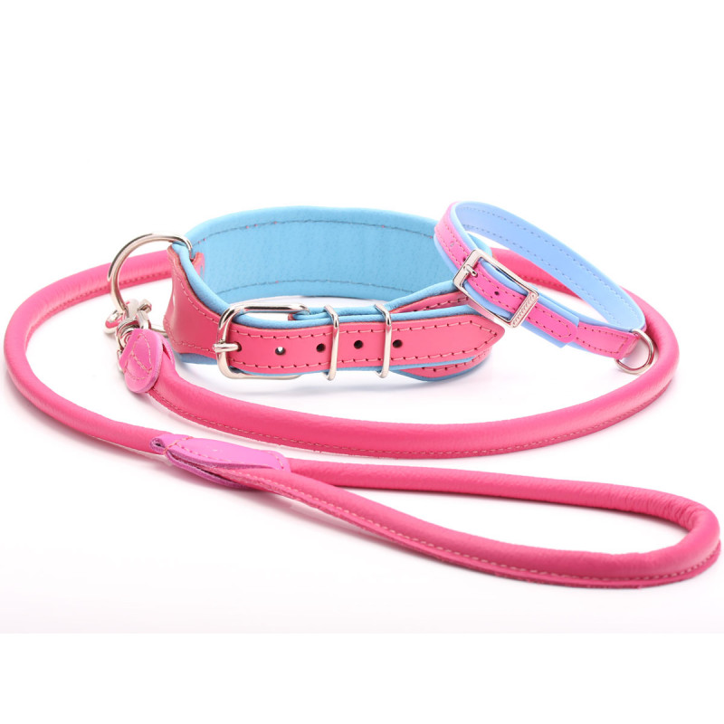 Conjunto De Collar Y Correa De Perro Hecho A Mano De Cuero Rosa Y Azul Bebé