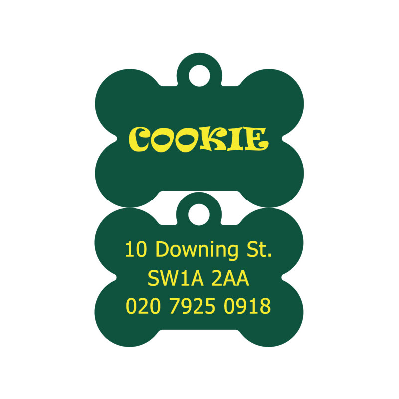 Nuestras placas de identificación son extremadamente populares porque son coloridas, únicas y se pueden personalizar por completo. La impresión sobre aluminio nos permite tener un acabado duradero y muy visible. ¡Qué mejor manera de mantener a su perro seguro y elegante que una placa de identificación personalizada y colorida! Puede personalizar cada lado de la etiqueta de forma independiente. La mayoría de los clientes optan por imprimir el frente de la etiqueta con un solo nombre y personalizar la parte posterior de la etiqueta con todos los datos de contacto importantes. Incluimos un llavero de gran peso que puede usar para sujetarlo a su collar existente. Es lo suficientemente fuerte para garantizar que la etiqueta nunca se caiga.