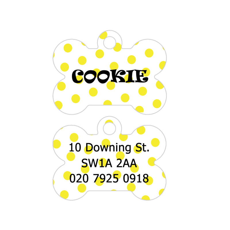 Nuestras placas de identificación son extremadamente populares porque son coloridas, únicas y se pueden personalizar por completo. La impresión sobre aluminio nos permite tener un acabado duradero y muy visible. ¡Qué mejor manera de mantener a su perro seguro y elegante que una placa de identificación personalizada y colorida! Puede personalizar cada lado de la etiqueta de forma independiente. La mayoría de los clientes optan por imprimir el frente de la etiqueta con un solo nombre y personalizar la parte posterior de la etiqueta con todos los datos de contacto importantes. Incluimos un llavero de gran peso que puede usar para sujetarlo a su collar existente. Es lo suficientemente fuerte para garantizar que la etiqueta nunca se caiga.