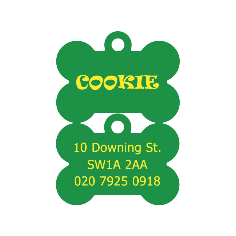 Nuestras placas de identificación son extremadamente populares porque son coloridas, únicas y se pueden personalizar por completo. La impresión sobre aluminio nos permite tener un acabado duradero y muy visible. ¡Qué mejor manera de mantener a su perro seguro y elegante que una placa de identificación personalizada y colorida! Puede personalizar cada lado de la etiqueta de forma independiente. La mayoría de los clientes optan por imprimir el frente de la etiqueta con un solo nombre y personalizar la parte posterior de la etiqueta con todos los datos de contacto importantes. Incluimos un llavero de gran peso que puede usar para sujetarlo a su collar existente. Es lo suficientemente fuerte para garantizar que la etiqueta nunca se caiga.