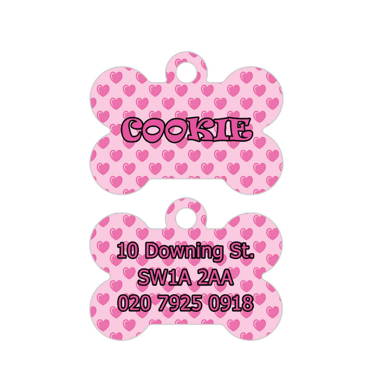 Nuestras placas de identificación son extremadamente populares porque son coloridas, únicas y se pueden personalizar por completo. La impresión sobre aluminio nos permite tener un acabado duradero y muy visible. ¡Qué mejor manera de mantener a su perro seguro y elegante que una placa de identificación personalizada y colorida! Puede personalizar cada lado de la etiqueta de forma independiente. La mayoría de los clientes optan por imprimir el frente de la etiqueta con un solo nombre y personalizar la parte posterior de la etiqueta con todos los datos de contacto importantes. Incluimos un llavero de gran peso que puede usar para sujetarlo a su collar existente. Es lo suficientemente fuerte para garantizar que la etiqueta nunca se caiga.