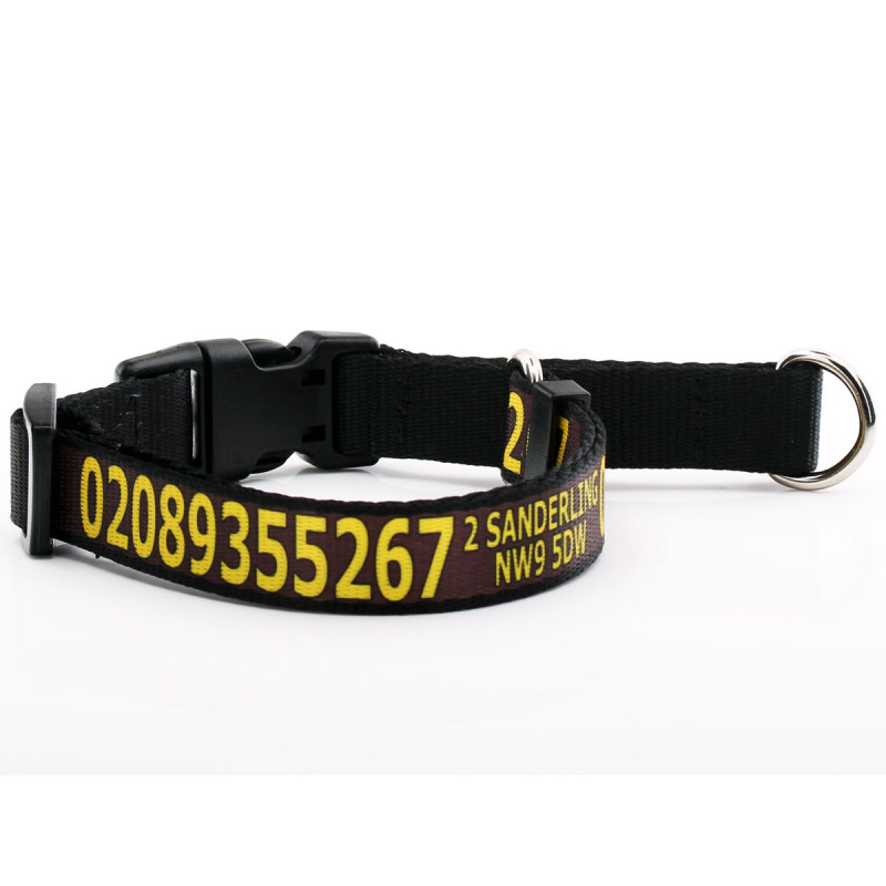 Nos colliers pour chiens réglables de première classe sont de haute qualité et personnalisés avec votre téléphone et votre adresse ou tout autre texte de votre choix. Grâce à la technologie d'impression la plus récente et la plus performante, nous sommes en mesure de vous fournir une identification de qualité supérieure pour votre chien, qui est facile à lire, extrêmement durable et conforme à l'ordonnance de 1992 sur le contrôle des chiens. Quelle que soit l'usure, l'impression ne s'efface pas et ne se décolore pas. Le collier est conçu pour être efficace et extrêmement sûr. Contrairement aux modèles de moindre importance qui utilisent un collier étrangleur pouvant causer des blessures à votre animal de compagnie, notre modèle est particulièrement sûr car aucune chaîne n'est utilisée avec ce modèle. Notre fabrication est appréciée des entraîneurs de chiens pour sa durabilité, son efficacité dans l'entraînement et sa sécurité. Le collier est fabriqué en polyester durable et est conçu avec une solide boucle à déclenchement rapide pour plus de sécurité et de commodité.