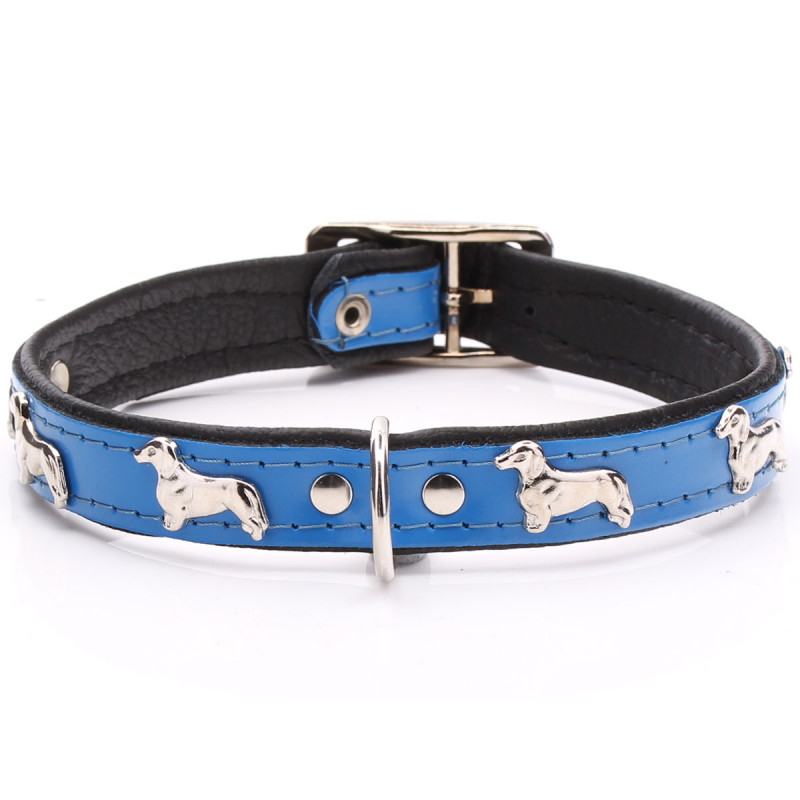 Peu de races de chiens sont aussi loyales ou courageuses que le puissant Teckel. Chouchoutez votre chien en forme de saucisson avec ce superbe collier décoré de rivets brillants, qui ressemblent à leur fière silhouette. Fabriqué en cuir avec un rembourrage doux, ce col est garanti solide et confortable. Nous proposons ce collier de Teckel en deux tailles et 5 couleurs. Veillez à le faire correspondre à l'une de nos laisses, plaques imprimées ou gamelles personnalisées.