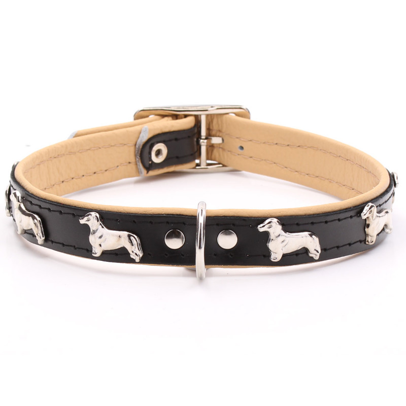 Peu de races de chiens sont aussi loyales ou courageuses que le puissant Teckel. Chouchoutez votre chien en forme de saucisson avec ce superbe collier décoré de rivets brillants, qui ressemblent à leur fière silhouette. Fabriqué en cuir avec un rembourrage doux, ce col est garanti solide et confortable. Nous proposons ce collier de Teckel en deux tailles et 5 couleurs. Veillez à le faire correspondre à l'une de nos laisses, plaques imprimées ou gamelles personnalisées.