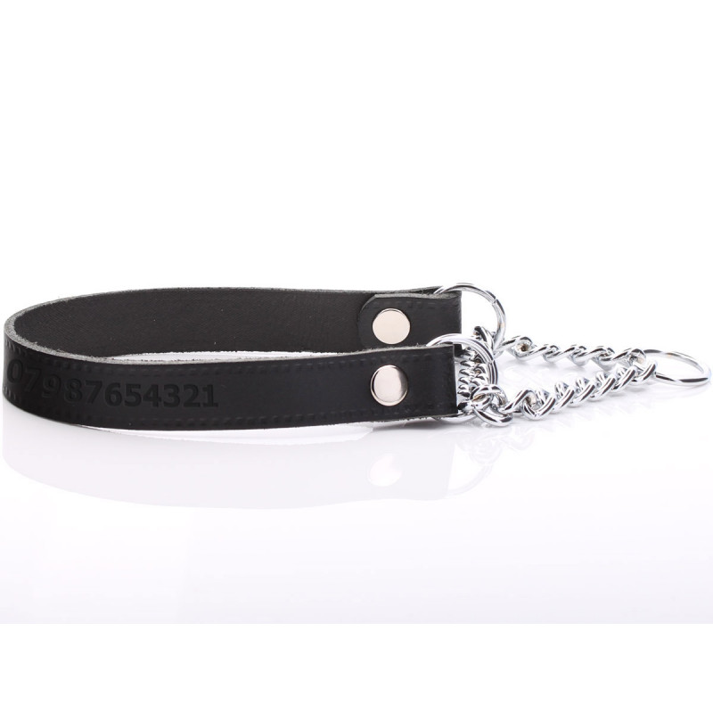Afin de donner un contrôle supplémentaire tout en assurant la sécurité de votre chien, un collier de martingale se compose de deux boucles - une qui s'attache autour du cou et l'autre qui resserre le collier. Aussi connu sous le nom de collier demi-étrangleur, son principal avantage est qu'il donne la bonne quantité de tension sans étouffer votre chien. Nous donnons la possibilité de personnaliser ce collier avec un gaufrage. Il est recommandé de garder le gaufrage aussi court que possible. Par exemple, vous pouvez entrer votre numéro de téléphone, votre code postal et votre numéro de maison. Les éleveurs et les entraîneurs recommandent vivement les colliers de martingale pour les raisons susmentionnées. Les propriétaires de lévriers font confiance à cette conception depuis des années car elle empêche la tête du chien de glisser lorsqu'il est provoqué. Il est important de retirer ce collier si vous prévoyez de laisser votre chien en liberté. Il pourrait se coincer en traversant des zones de végétation.