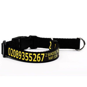 Nos colliers pour chiens réglables de première classe sont de haute qualité et personnalisés avec votre téléphone et votre adresse ou tout autre texte de votre choix. Grâce à la technologie d'impression la plus récente et la plus performante, nous sommes en mesure de vous fournir une identification de qualité supérieure pour votre chien, qui est facile à lire, extrêmement durable et conforme à l'ordonnance de 1992 sur le contrôle des chiens. Quelle que soit l'usure, l'impression ne s'efface pas et ne se décolore pas. Le collier est conçu pour être efficace et extrêmement sûr. Contrairement aux modèles de moindre importance qui utilisent un collier étrangleur pouvant causer des blessures à votre animal de compagnie, notre modèle est particulièrement sûr car aucune chaîne n'est utilisée avec ce modèle. Notre fabrication est appréciée des entraîneurs de chiens pour sa durabilité, son efficacité dans l'entraînement et sa sécurité. Le collier est fabriqué en polyester durable et est conçu avec une solide boucle à déclenchement rapide pour plus de sécurité et de commodité.