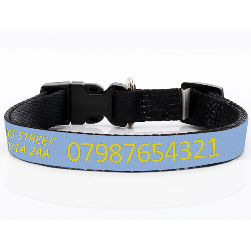 Nous avons créé ce collier parce que nous aimons nos chiens et que nous voulons les protéger. Nous avons pris un collier très pratique et très solide et l'avons perfectionné en offrant le plus grand espace de personnalisation disponible. Grâce à un équipement de pointe, nous pouvons imprimer très clairement vos informations sur le collier. Même le petit texte sera lisible et pourrait contribuer à sauver la vie de votre chien. Vous pouvez personnaliser ce collier avec le texte de votre choix. La loi britannique stipule que le collier doit comporter le nom et l'adresse du propriétaire, mais nous vous recommandons vivement d'ajouter également votre numéro de téléphone portable. De plus, vous pouvez ajouter d'autres informations importantes telles que l'état de santé, le numéro de téléphone secondaire ou le numéro de téléphone de votre vétérinaire. Les propriétaires qui des chiens qui aiment se trainer dans la boue seront heureux d'apprendre que les colliers sont lavables en machine. Il suffit de les mettre avec vos tissus de couleur et d'utiliser un détergent doux et à basse température. Si vous ne les lavez pas tous les jours, votre collier peut être utilisé pendant des années. Une solide boucle en plastique durci rend ce collier facile à mettre et à enlever. Nous utilisons également un anneau en D soudé qui s'attache à toute laisse de chien, il est fait pour être incassable !