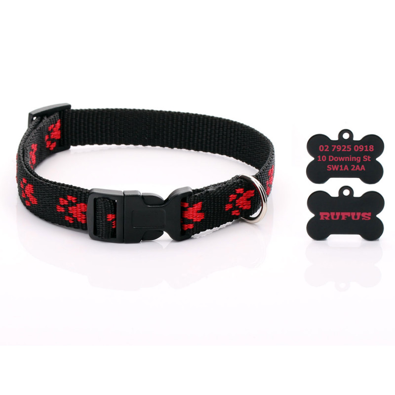 Collier Pour Chien Noir Imprimé Patte Avec Étiquette Assortie