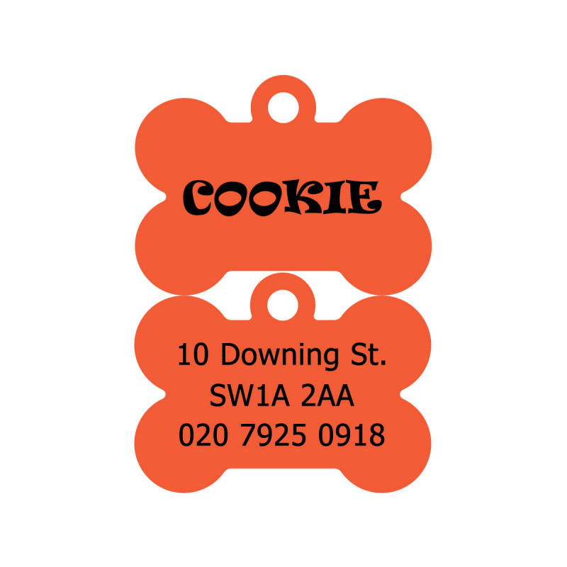 Nos plaques d’identité pour chiens sont extrêmement populaires car elles sont colorées, uniques et peuvent être entièrement personnalisées. L'impression sur aluminium nous permet d'avoir une finition durable qui est très visible. Quelle meilleure façon de protéger votre chien et de lui donner du style avec une plaque d’identité colorée Personalised Dog. Vous pouvez personnaliser chaque côté de la plaque indépendamment. La plupart des clients choisissent de faire imprimer le devant de la plaque avec le nom et le dos personnalisé avec les coordonnées. Nous incluons un porte-clés lourd que vous pouvez utiliser pour l'attacher à votre collier existant. Il est suffisamment solide pour que la plaque ne tombe jamais.