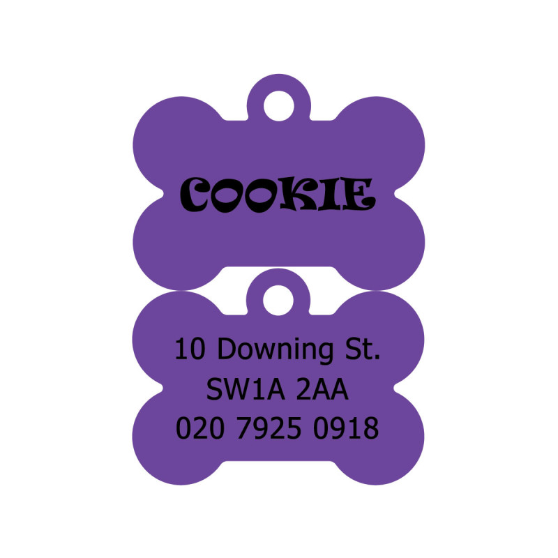 Nos plaques d’identité pour chiens sont extrêmement populaires car elles sont colorées, uniques et peuvent être entièrement personnalisées. L'impression sur aluminium nous permet d'avoir une finition durable qui est très visible. Quelle meilleure façon de protéger votre chien et de lui donner du style avec une plaque d’identité colorée Personalised Dog. Vous pouvez personnaliser chaque côté de la plaque indépendamment. La plupart des clients choisissent de faire imprimer le devant de la plaque avec le nom et le dos personnalisé avec les coordonnées. Nous incluons un porte-clés lourd que vous pouvez utiliser pour l'attacher à votre collier existant. Il est suffisamment solide pour que la plaque ne tombe jamais.