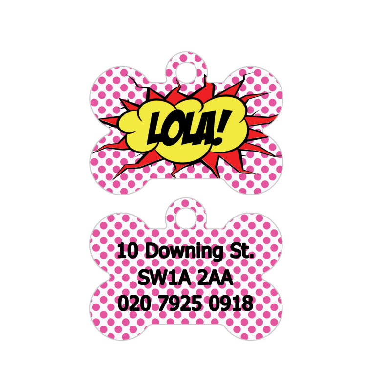 Nos plaques d’identité pour chiens sont extrêmement populaires car elles sont colorées, uniques et peuvent être entièrement personnalisées. L'impression sur aluminium nous permet d'avoir une finition durable qui est très visible. Quelle meilleure façon de protéger votre chien et de lui donner du style avec une plaque d’identité colorée Personalised Dog. Vous pouvez personnaliser chaque côté de la plaque indépendamment. La plupart des clients choisissent de faire imprimer le devant de la plaque avec le nom et le dos personnalisé avec les coordonnées. Nous incluons un porte-clés lourd que vous pouvez utiliser pour l'attacher à votre collier existant. Il est suffisamment solide pour que la plaque ne tombe jamais.