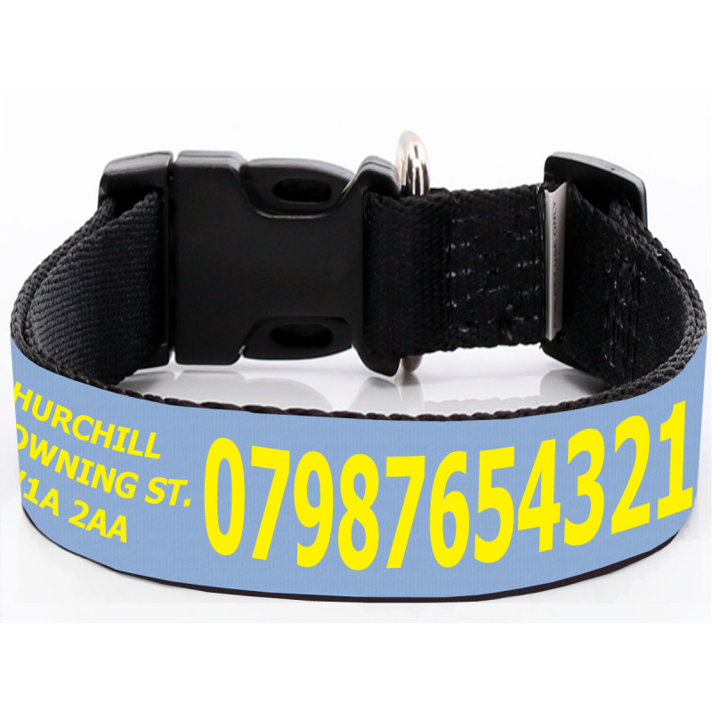 - È possibile personalizzare questo collare con qualsiasi testo che desiderate. legge stabilisce Regno Unito che il collare deve nome e l'indirizzo del proprietario, ma si consiglia vivamente di aggiungere il tuo numero di cellulare pure. Inoltre, è possibile aggiungere altre informazioni importanti come lo stato di salute, il numero di telefono secondario, o il numero di telefono del vostro veterinario.