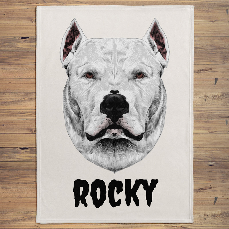 Pătură de lână bej deschis super moale, personalizată cu numele câinelui dvs. în culoarea de imprimare aleasă. Măsoară 140 cm x 95 cm.