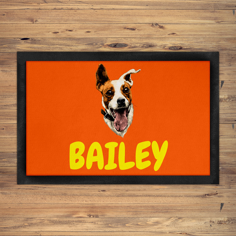 Ta podloga za pasje posode je natisnjena z imenom vašega psa v barvi in slogu pisave po vaši izbiri. Zgornji del podloge je prekrit s trpežno tkanino. Uporabljamo najsodobnejšo tehnologijo za tisk na vlakna tkanine in pustimo trajno personalizacijo. Debela gumijasta podlaga bo preprečila drsenje podloge in, kar je še pomembneje, zaščitila vaša tla pred nadležnimi sledovi, ki jih posode ponavadi pustijo. Izbirate lahko med dvema velikostma: veliko (60x40cm) ali majhno (45x25cm). Če ugotovite, da morate preprogo očistiti, jo preprosto operite v umivalniku in obesite, da se posuši.